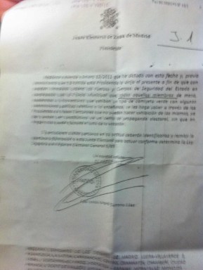 La noticia la pasaban, a nuestros apoderados en Móstoles, un grupo de profesores que portaban las camisetas verdes que recorrían todos los colegios electorales con el fin de dar visibilidad a las reinvindicaciones de los enseñantes. Nos comunicaron que en otro colegio, el Blas de Otero, a un interventor de IU le habían prohibido llevar la camiseta basándose en un escrito enviado por la JEC de Madrid a las 11:17hrs a ese colegio.