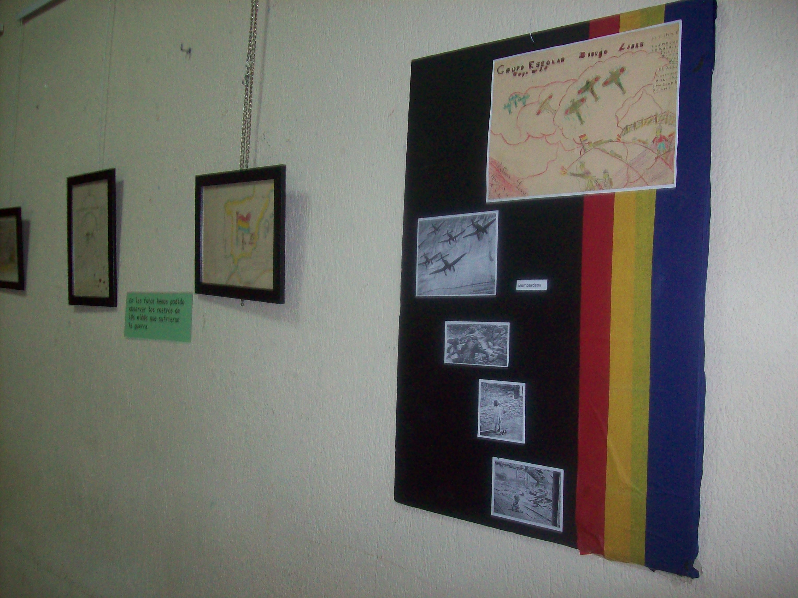 La pequeña muestra de dibujos expuesta, 24 en total, nos hace ver esas sensaciones de miedo, de angustia, de dolor que trajo la guerra. Dando lugar que esa cotidianeidad de guerra no era estéril a sus cortas vidas. La mayoría de los dibujos evocaban bombardeos hacia los núcleos poblacionales. Hay otros temas en sus dibujos como la toma de Teruel que muestra una gran alegría, banderas republicanas, el frente en Usera, la lucha entre la legalidad y los golpistas fascistas etc.
