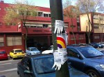 Compañeros de SOMOS-Republicanos de Móstoles realizaron una pegada de más de 2000 pegatinas convocando a la manifestación para el 14 de abril. El Ayuntamiento del PP tiene dadas órdenes expresas de quitar todo cartel, pegatina o folleto que haga referencia a cualquier acto político o social que les ponga en entredicho, como es el caso del llamamiento republicano, no así a la publicidad de negocios o discotecas. En las imágenes puede apreciarse como un equipo de limpieza del ayuntamiento quita con agua a presión las pegatinas.