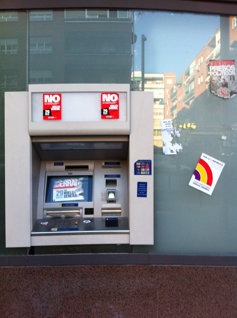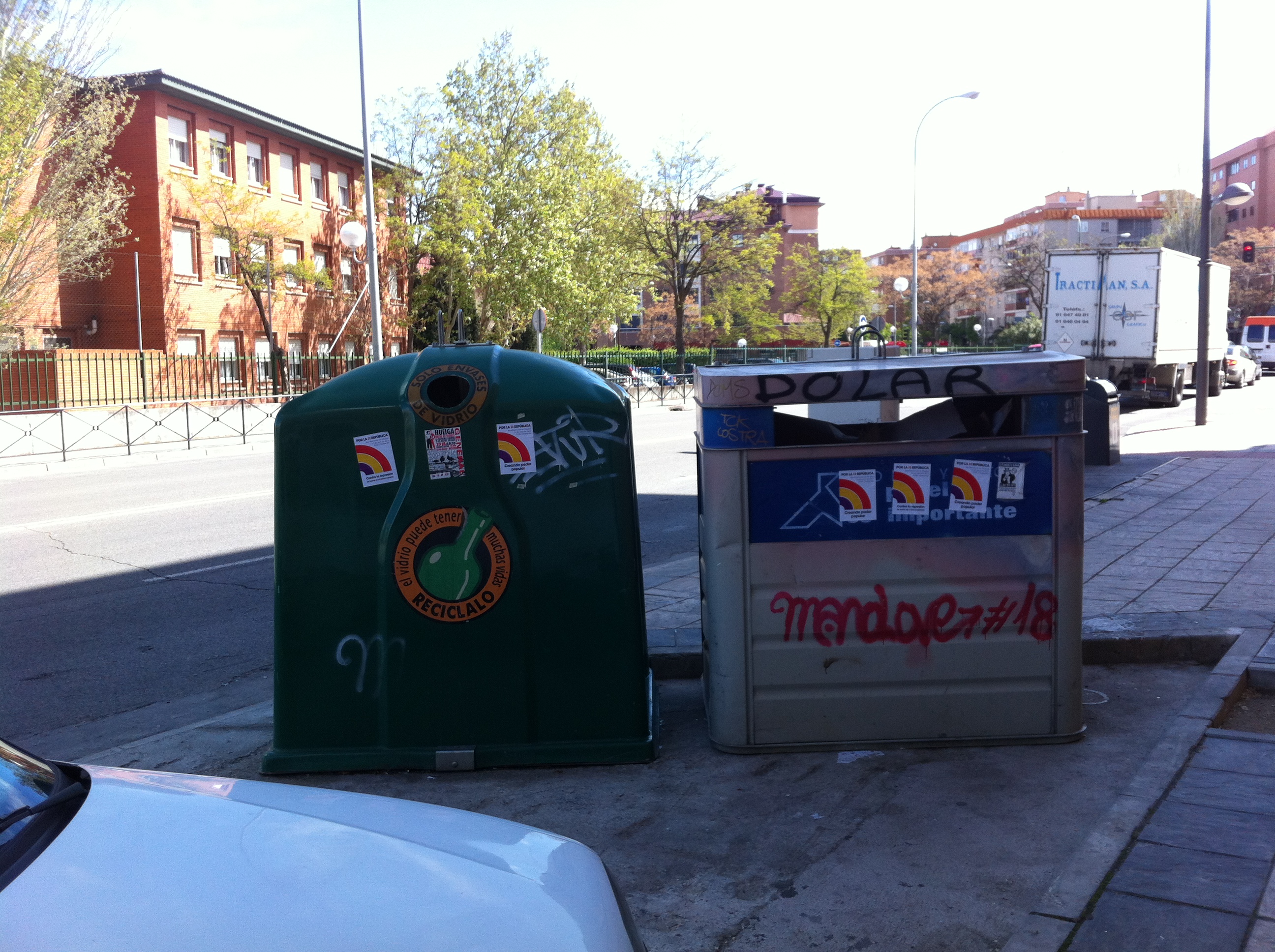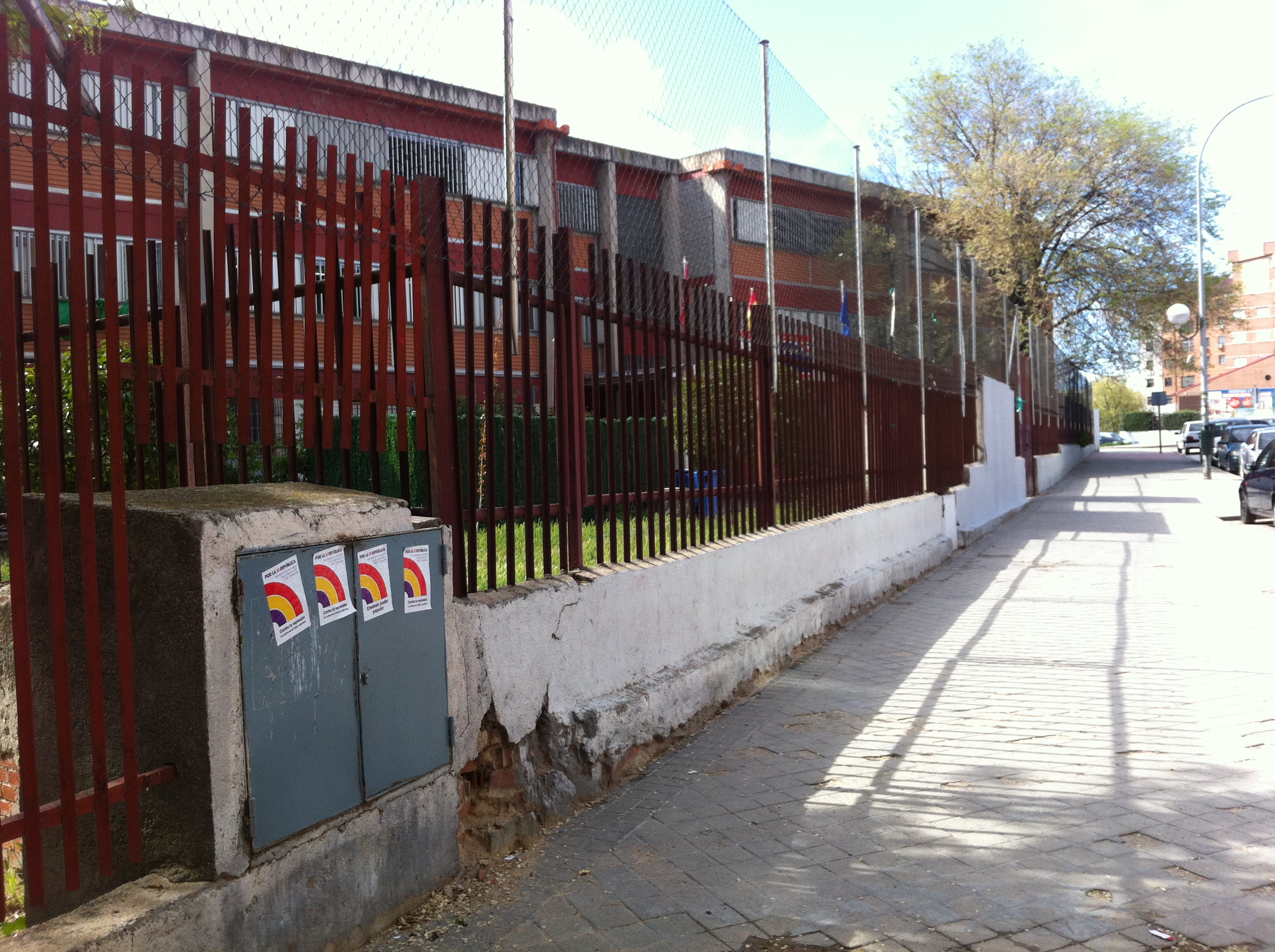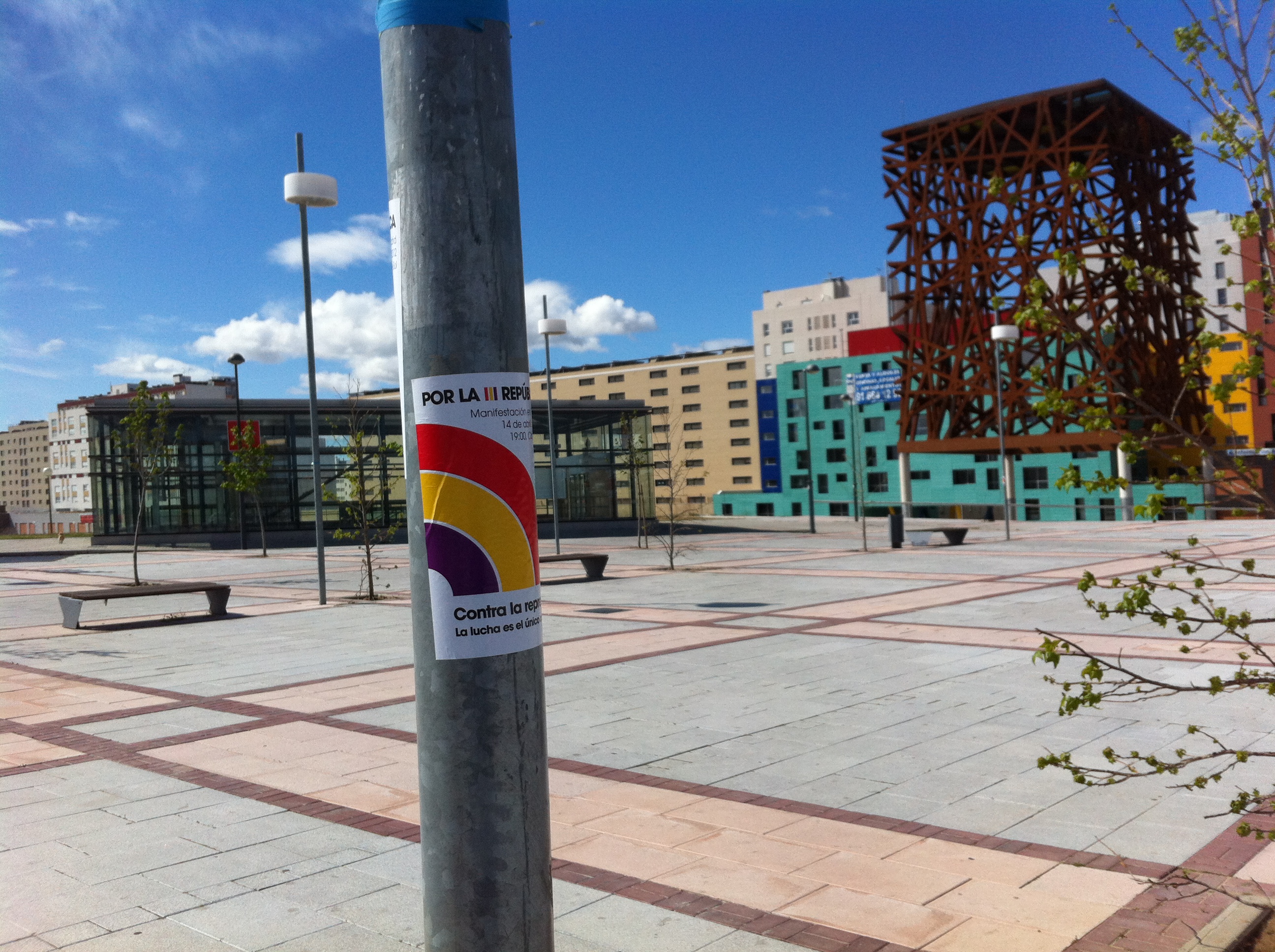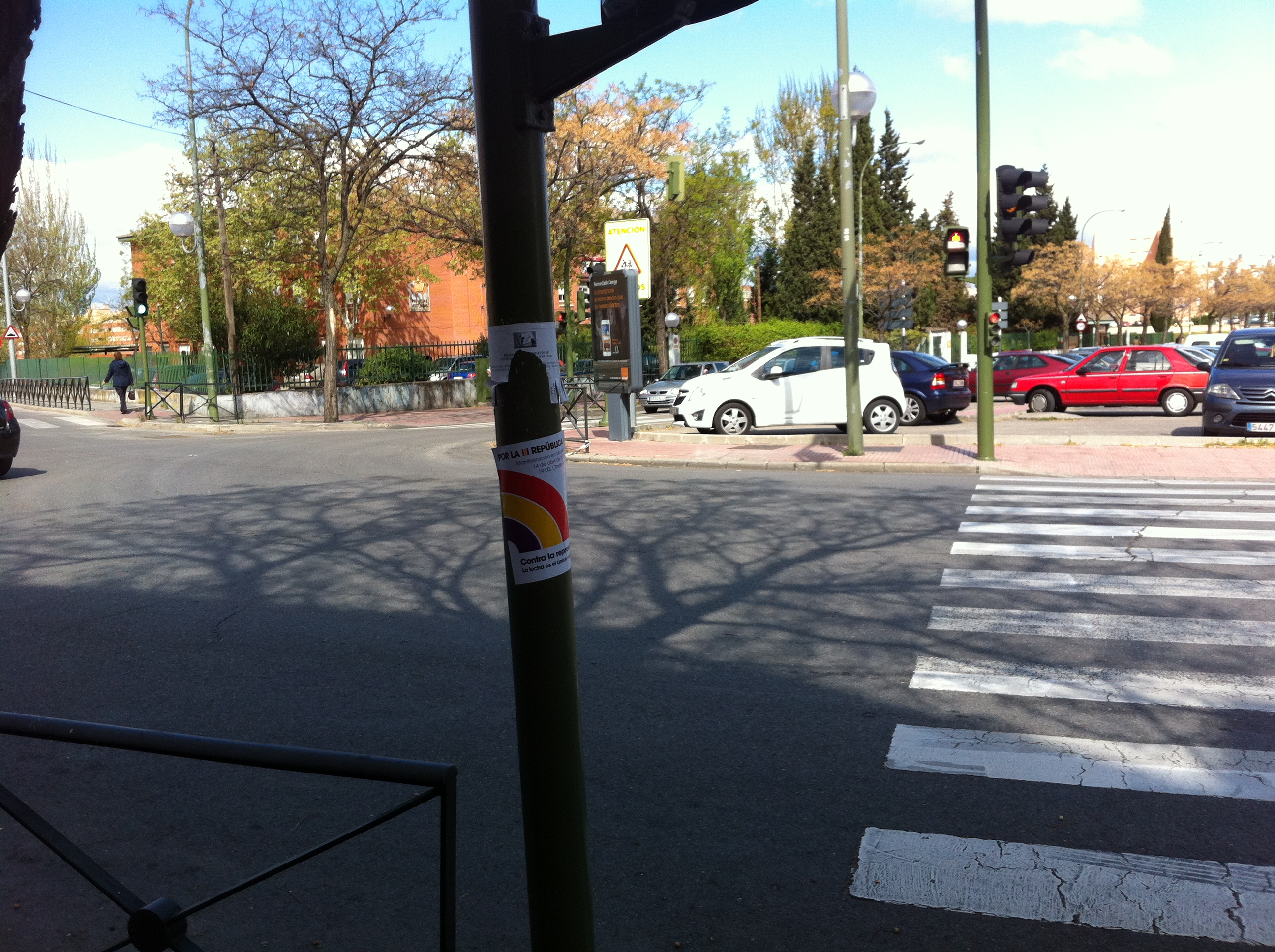 Compañeros de SOMOS-Republicanos de Móstoles realizaron una pegada de más de 2000 pegatinas convocando a la manifestación para el 14 de abril. El Ayuntamiento del PP tiene dadas órdenes expresas de quitar todo cartel, pegatina o folleto que haga referencia a cualquier acto político o social que les ponga en entredicho, como es el caso del llamamiento republicano, no así a la publicidad de negocios o discotecas. En las imágenes puede apreciarse como un equipo de limpieza del ayuntamiento quita con agua a presión las pegatinas.