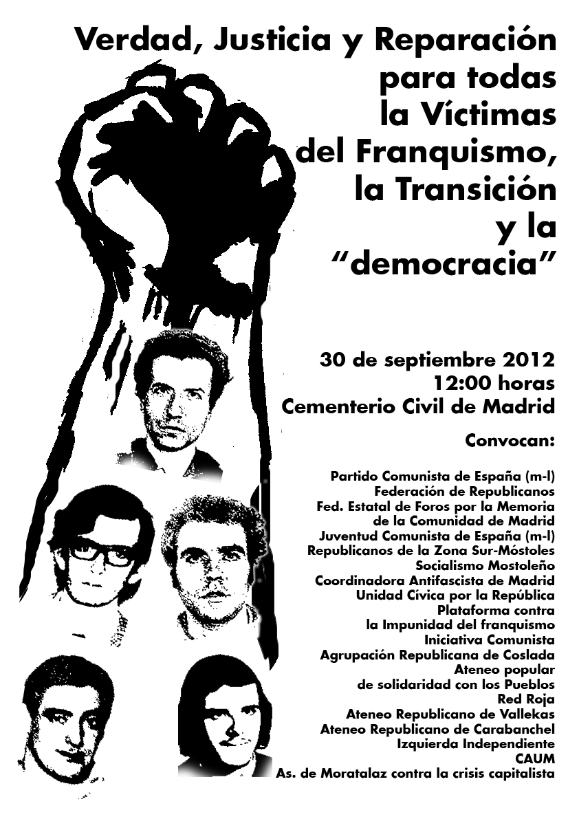 27 de septiembre 2012, Madrid – Una veintena de organizaciones, entre las que se encuentra la Federación Republicanos, se congregarán este domingo 30 de septiembre en el cementerio civil de Madrid para rendir homenaje a los últimos fusilados del franquismo, de cuyas ejecuciones se cumplen hoy 37 años.