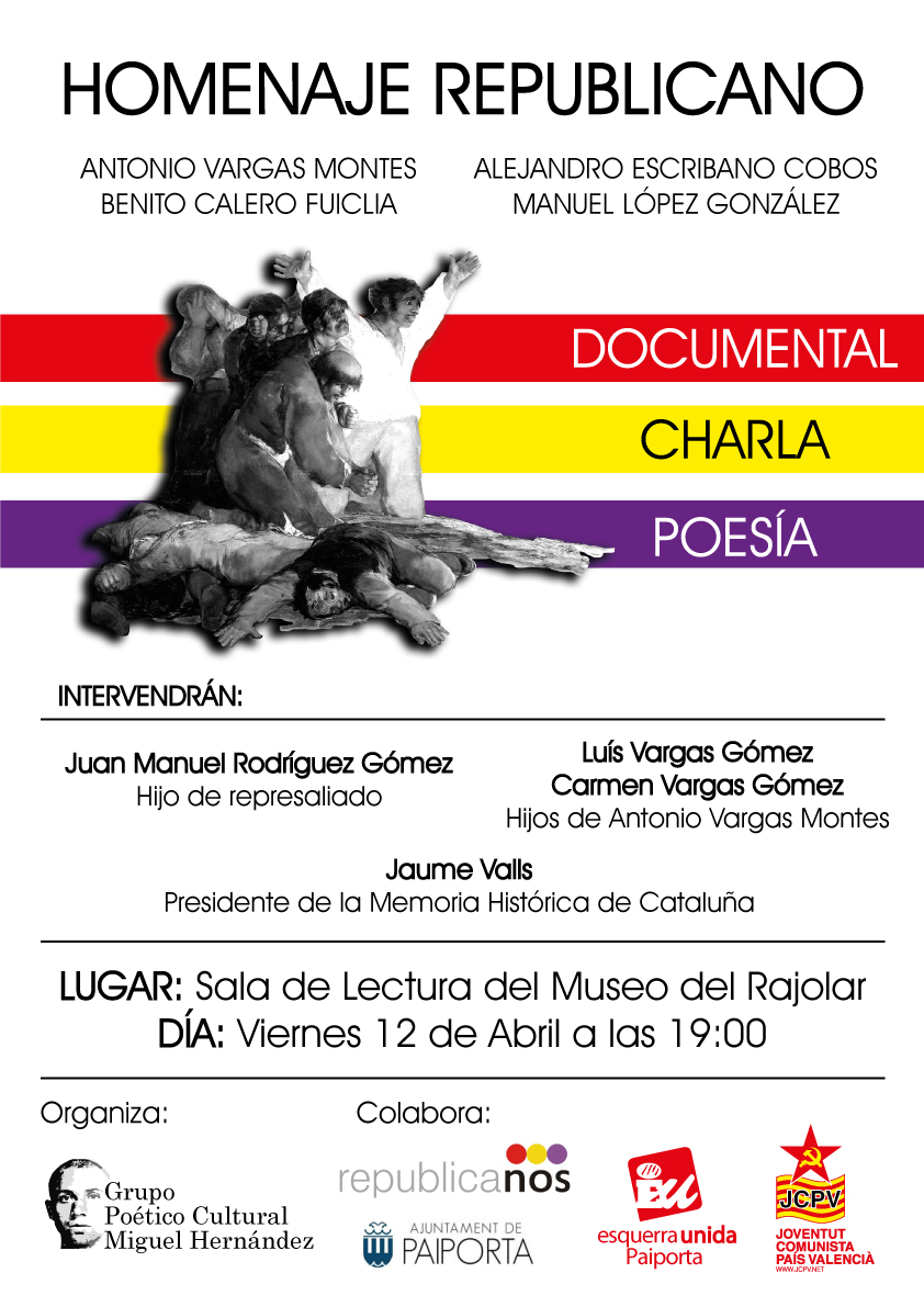 Viernes 12 de abril: Homenaje republicano organizado por el Grupo Poético Cultural Miguel Hernández, RPS Valencia y otras organizaciones (ver cartel más abajo). Documental, charla y poesía, a partir de las 19h en la Sala de Lectura del Museo del Rajolar, C. Enrique Reig, 3 de Paiporta (Valencia).