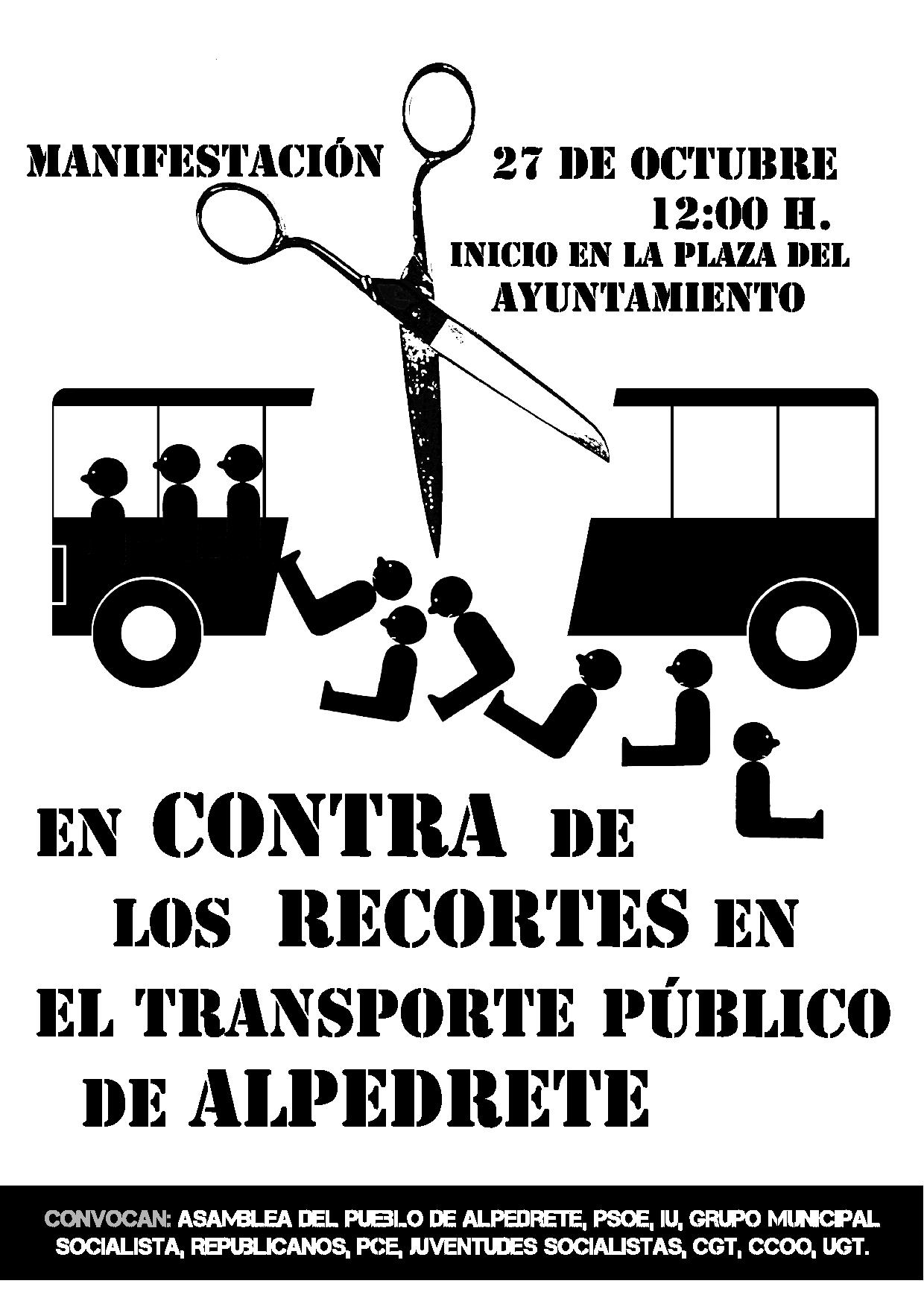 Y llamamos a participar en una MANIFESTACIÓN el próximo 27 de Octubre a partir de las 12 desde el Ayuntamiento de Alpedrete, contra estos recortes y los que nos amenazan para el comienzo del año.