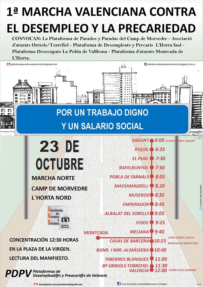 PLATAFORMAS DE DESEMPLADOS Y PRECARIOS DE VALENCIA que coordina a las distintas plataformas y Asambleas de Desempleados que convocan esta Marcha; Plataforma de Parados y Paradas del Camp de Morvedre, Associació d’aturats Orriols/Torrefiel, Plataforma de Desempleats y Precaris L`Horta Sud, Plataforma Desocupats la Pobla de Vallbona y Plataforma d’aturats Montcada de L’Horta.