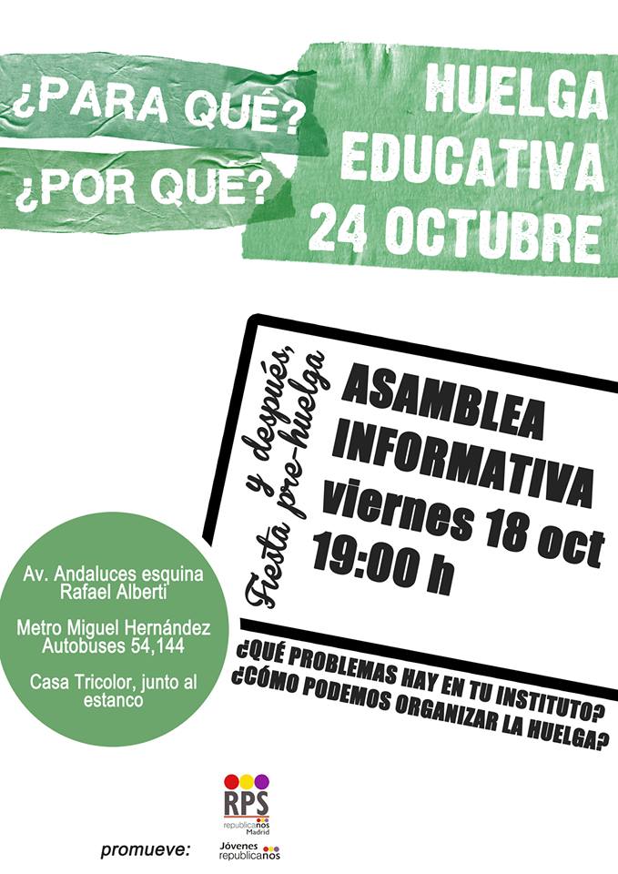 - Pero una unidad extensa debe tener objetivos igualmente amplios. El problema es más profundo que las reivindicaciones concretas de los diferentes sectores: es POLÍTICO. La cuestión es quién toma las decisiones, de qué manera y en función de qué intereses. Es hora de plantearse, pues, objetivos que vayan a la raíz del problema. Y, como primera tarea, es necesario exigir la dimisión de Wert y del Gobierno en pleno, por su criminal política de agresión a los derechos sociales, laborales y políticos.
