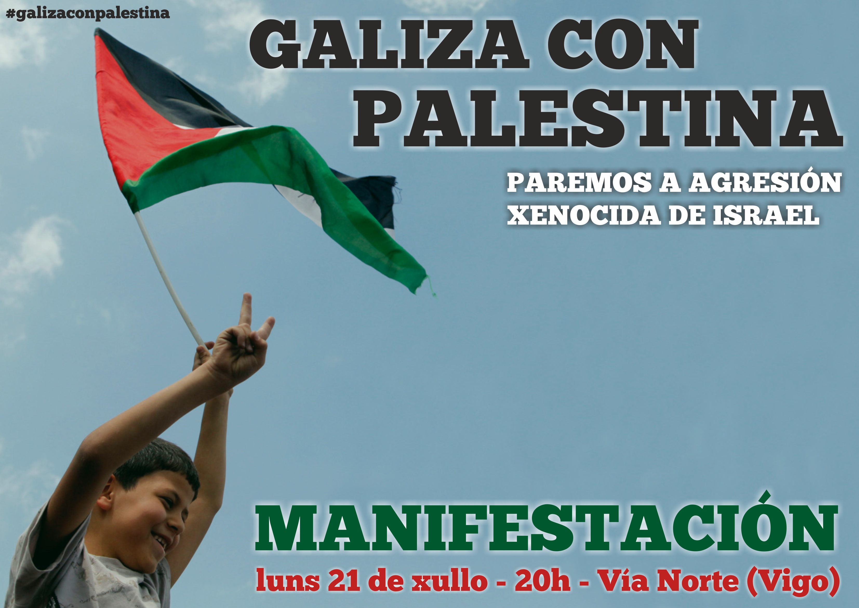 Os galegos e galegas reclamamos que os respònsables desta nova agresión sexan levados ante os tribunais internacionais e xuzgados por delito de xenocidio, que a Unión Europea e o Estado español esixan a Israel o cese inmediato desta agresión e que se cumpran os incontabeis acordos de Nacions Unidas que, entre outros aspectos, implican o abandono dos territorios ocupados polo estado de Israel .