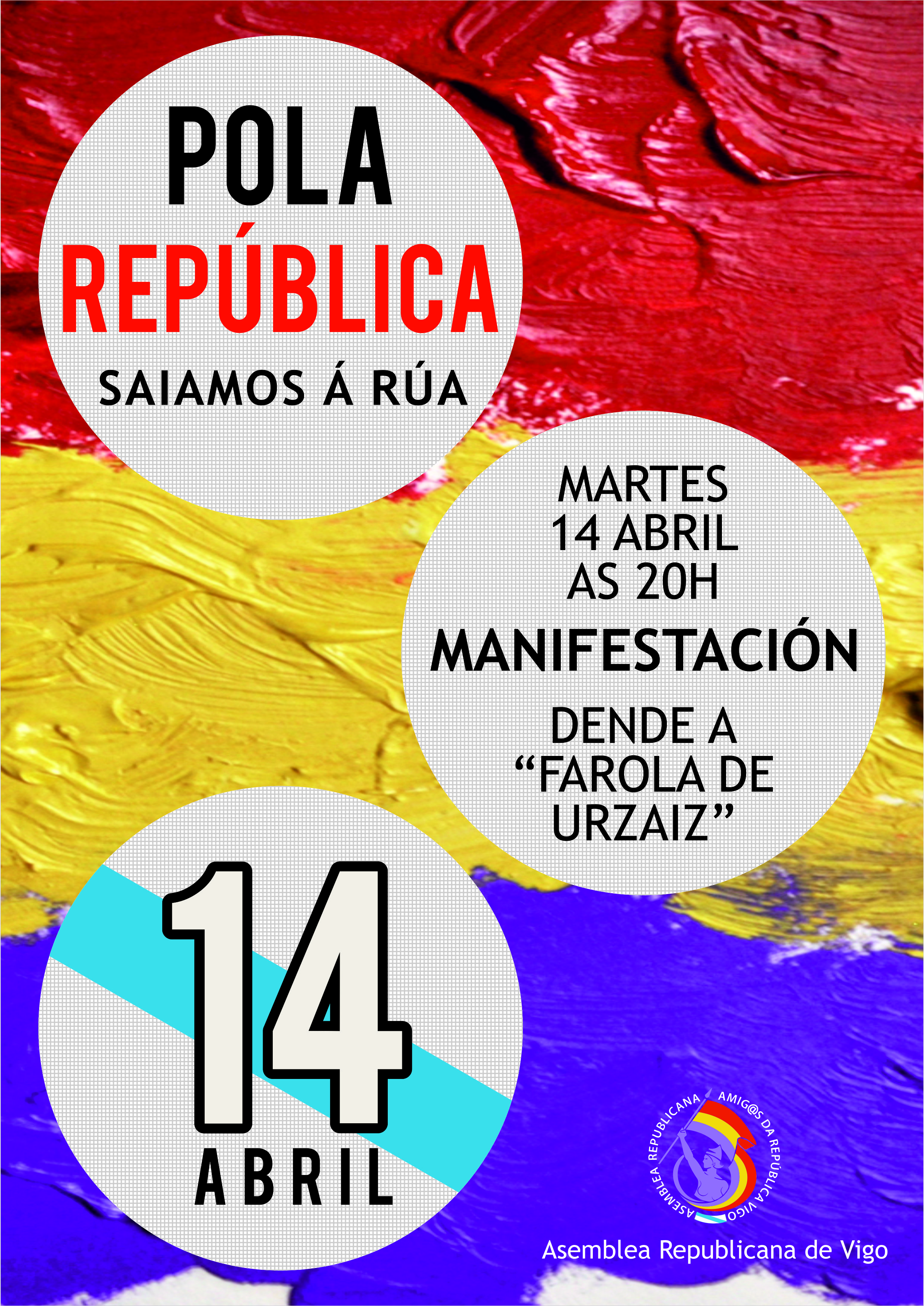 Como todos os anos dende 2012, a ASEMBLEA REPUBLICANA DE VIGO “Amig@s da República” organiza unha manifestación republicana que con motivo do 84 aniversario da proclamación da República terá lugar o martes día 14 de abril ás 20 horas dende a farola de Urzaiz ata a rúa da II República. Ao final da mesma haberá distintas intervencións, entre elas a do xornalista Eduardo Rolland que lera un comunicado. O acto rematara coa interpretación do himno galego e do himno de Riego.