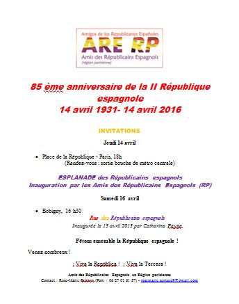 El sábado, 16 de abril de 2016, rendimos un sencillo y emocionante homenaje a la República española en Bobigny, cerca de París, donde existe una calle de los Republicanos españoles desde el 13 de abril del 2013, inaugurada aquel día por la Señora alcaldesa Catherine Peyge, rodeada por una gran muchedumbre entusiasta y agradecida de Republicanos españoles, descendientes y amigos.