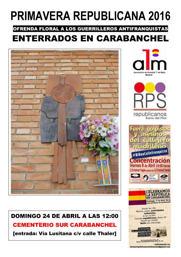 Quienes formamos parte de la JRM-JER no logramos entender cómo un gobierno que se dice progresista puede mantenerse ajeno a las reivindicaciones y conmemoraciones republicanas, máxime cuando otros ayuntamientos sí han tenido a bien organizar algún tipo de homenaje. Leer el resto de esta página »