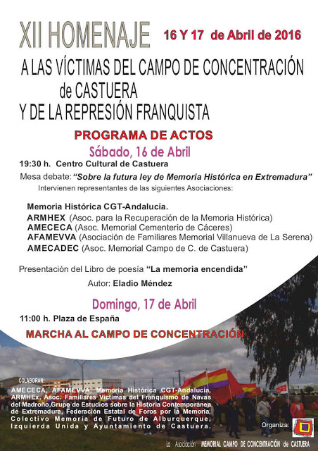 Mientras el domingo se repetía la marcha hacia el campo de concentración de Castuera, organizada por la asociación que se encarga de conservar su memoria, este lunes diputados del Grupo Socialista-SIEX en la Asamblea de Extremadura y miembros de la Asociación regional para la Recuperación de la Memoria Histórica (ARMHEX) han mantenido un encuentro de trabajo en Mérida en el que se ha abordado el borrador de la futura ley de recuperación de memoria en la que va a trabajar la Junta de Extremadura, así como otras cuestiones relacionadas con la divulgación o el cumplimiento de la legislación nacional sobre esta materia en Extremadura. Leer el resto de esta página »