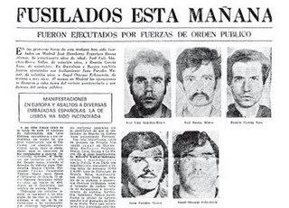Dos años más tarde, como represalia por la muerte del policia nacional Lucio Rodríguez en la calle de Alenza el 14 de julio de ese año, y digo represalia porque el consejo de guerra sumarisimo celebrado en El Goloso, los días 11 y 12 de septiembre contra varios militantes del FRAP (Frente Revolucionario Antifascista y Patriotico), tuvo todas las irregularidades propias de los juicios habidos bajo el fascismo, dando como resultado la condena a muerte de tres procesados, de los cuales fue ejecutado Jose Humberto Baena López.