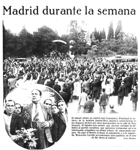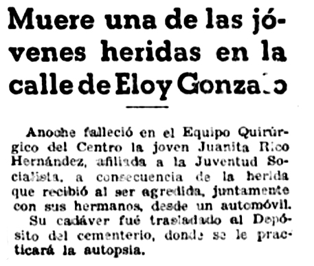 La familia Rico tenía un puesto de verduras en el mercado, regentado por su padre, que era ayudado por sus tres hijos. Juanita Rico había sido, al parecer, identificada entre los integrantes del grupo que repelió el ataque falangista y atacó a Cuellar. Dos coches aparcaron en la calle del Cardenal Cisneros, a la altura de la casa número 61, esquina con la calle Eloy Gonzalo. El tiroteo fue intenso. A la mañana siguiente, todo el mundo pudo ver los impactos que se repartían por toda la zona, sobre todo en la fachada de una tienda de tejidos, cuyos agujeros de bala se mantuvieron visibles durante años.