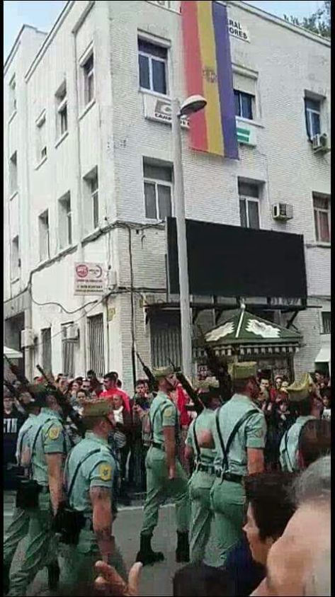 Algeciras (Cádiz), 10 abr (EFE).- El Lunes Santo ha dejado una curiosa imagen en Algeciras (Cádiz), donde los caballeros legionarios han realizado un desfile previo a la procesión por el centro de la ciudad y han tenido que pasar bajo una bandera republicana de grandes dimensiones.