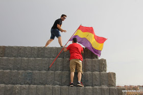 Llegamos al Memorial. Dos jóvenes republicanos arrancan los primeros aplausos cuando se encaraman a la pirámide y plantan la enseña tricolor.