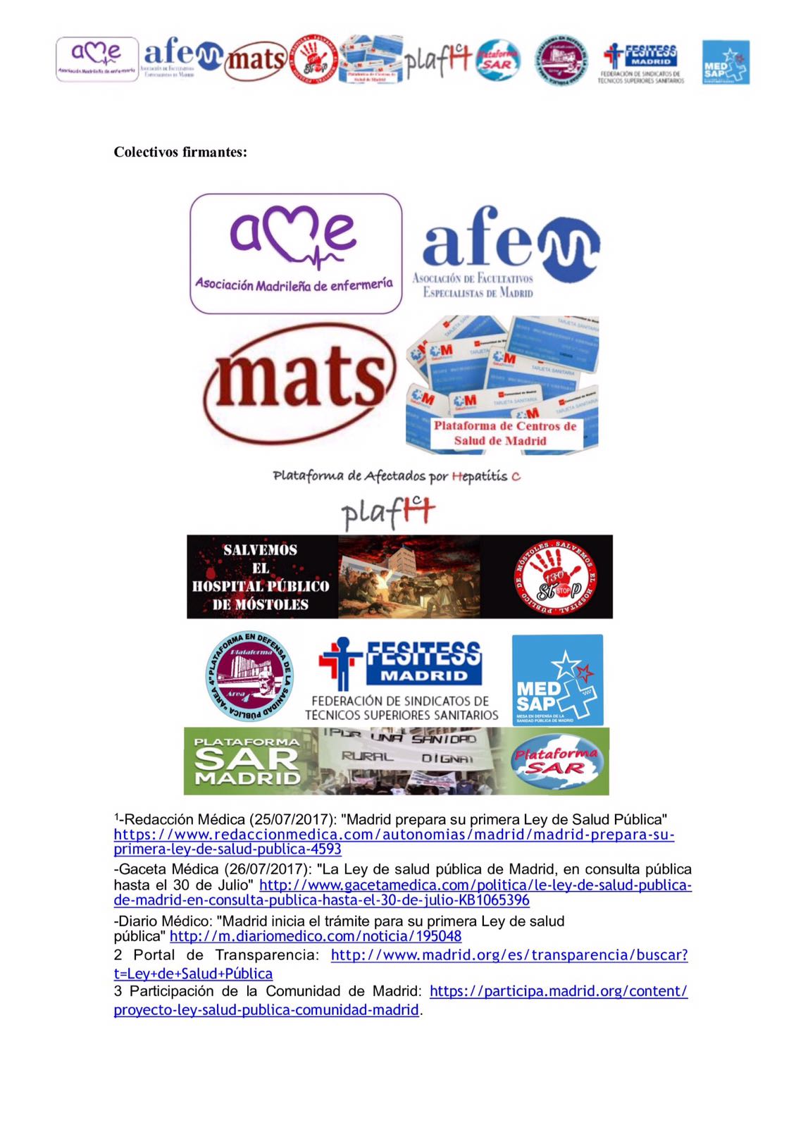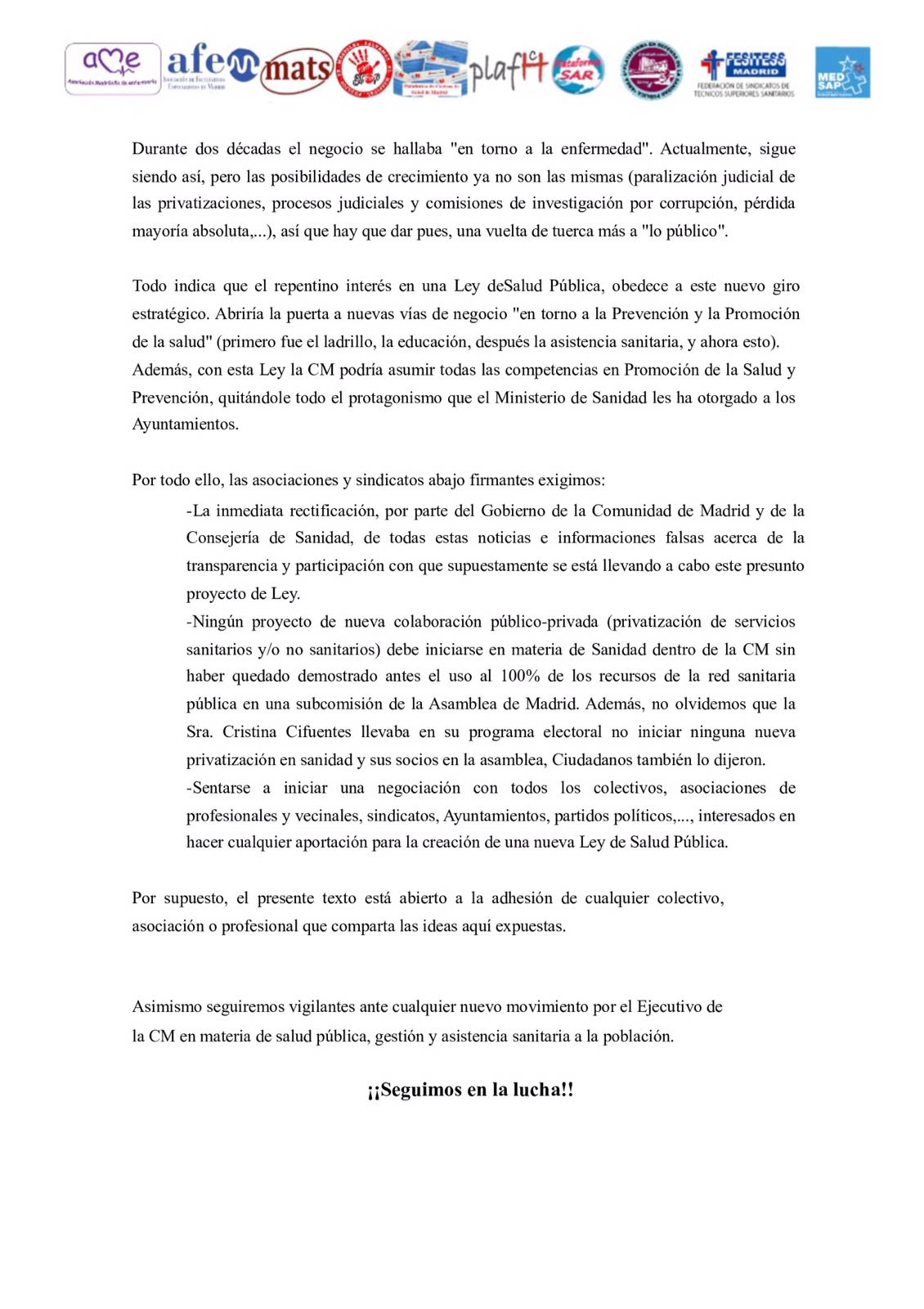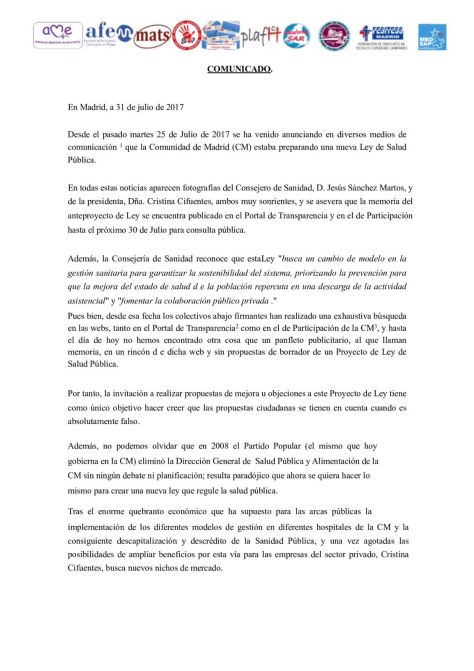 Firmado hasta el momento por diez colectivos, plataformas y sindicatos se ha emitido un comunicado dónde denuncian falta de transparencia y el afán privatizador de la Ley de Salud Pública de Cifuentes.