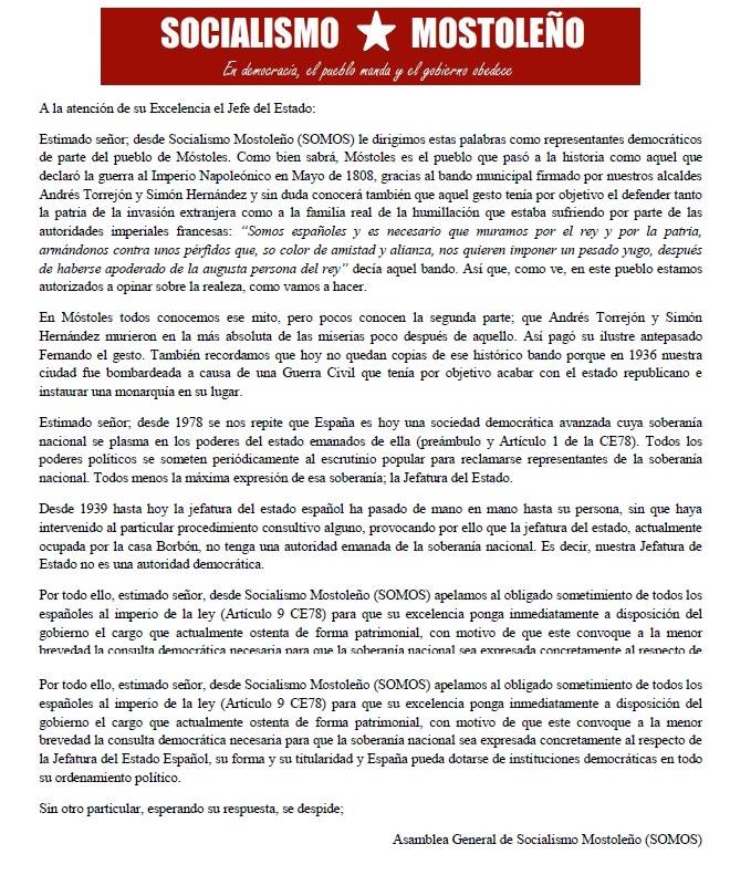 Socialismo Mostoleño, partido local de Móstoles, también acudirá a la concentración y tratará de hacer llegar al monarca una carta (que reproducimos mas abajo). Según su presidente “El lunes nos visita el representante de la máxima institución política española… la única que los españoles/as no podemos elegir. No podemos ni siquiera opinar sobre ella.