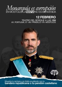 Tras salir la noticia que Felipe VI y consorte van ir el próximo dia 12 a Móstoles diversas organizaciones y partidos republicanos han convocado una concentración frente el teatro El Bosque a las doce de la mañana en defensa de una jefatura de estado democrática y el derecho a decidir a la que se suma Federación de Republicanos.