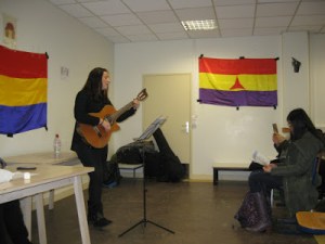 El 9 de enero de 2018, dos profesoras del líceo de Pantin (cerca de París) y los Amigos de los Republicanos españoles de Región parisina, invitamos a la cantautora andaluza Lucía Sócam, que honra la memoria republicana española, a darles un recital a nuestros alumnos a modo de “regalo de reyes”, para familiarizarlos con la temática de las canciones populares y de la memoria republicana y las reivindicaciones de “Verdad, Justicia y Reparación”. Así “ilustramos” gracias a la cantante, las nociones de “lugares y formas del poder”, los “héroes antifascistas” republicanos, los artistas comprometidos, otros héroes.
