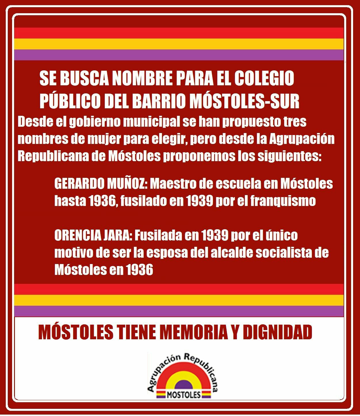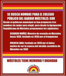 La Agrupación Republicana de Móstoles (ARM) responde a la petición del gobierno local para decidir el nombre del futuro colegio público sito en el barrio de Móstoles Sur, con la propuesta de los siguientes nombres de incuestionable valor simbólico para nuestra memoria popular: