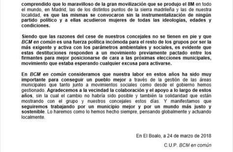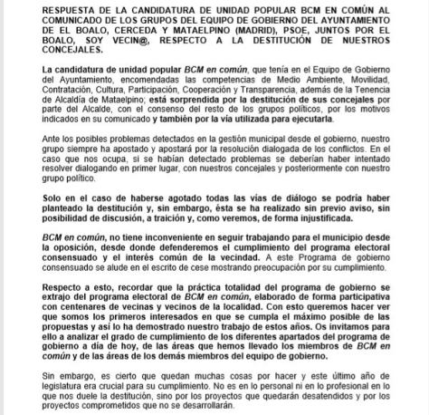 RESPUESTA DE LA CANDIDATURA DE UNIDAD POPULAR BCM EN COMÚN AL COMUNICADO DE LOS GRUPOS DEL EQUIPO DE GOBIERNO DEL AYUNTAMIENTO DE EL BOALO, CERCEDA Y MATAELPINO (MADRID), PSOE, JUNTOS POR EL BOALO, SOY VECIN@, RESPECTO A LA DESTITUCIÓN DE NUESTROS CONCEJALES.