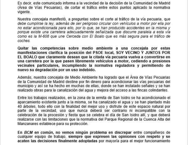RESPUESTA DE LA CANDIDATURA DE UNIDAD POPULAR BCM EN COMÚN AL COMUNICADO DE LOS GRUPOS DEL EQUIPO DE GOBIERNO DEL AYUNTAMIENTO DE EL BOALO, CERCEDA Y MATAELPINO (MADRID), PSOE, JUNTOS POR EL BOALO, SOY VECIN@, RESPECTO A LA DESTITUCIÓN DE NUESTROS CONCEJALES.