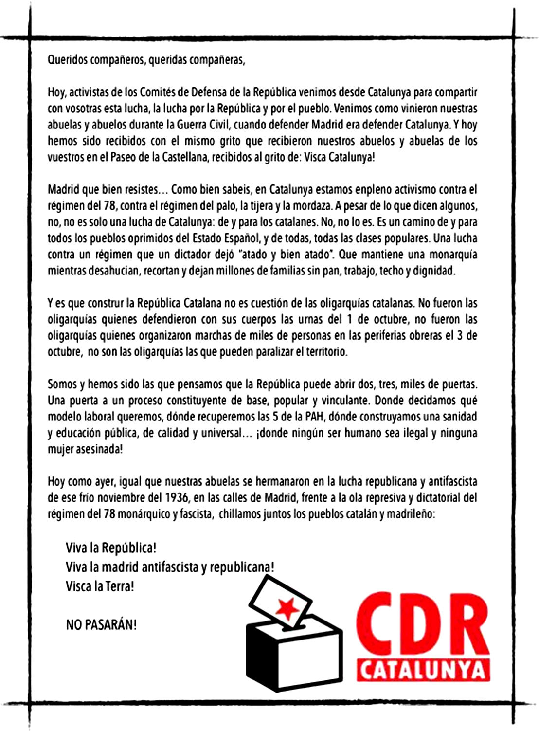 Copiado a continuación el Comunicado dirigido al pueblo de Madrid y que será leído en la Puerta del Sol por una compañera y un compañero de los CDRs de Catalaunya que viajarán expresamente.