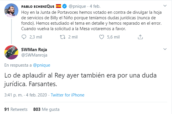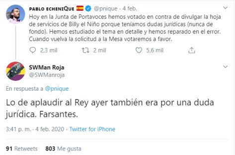 Posteriormente, el diputado de Podemos Pablo Echenique aclaraba en su cuenta de Twitter que votaron en contra porque tenían dudas jurídicas, asegurando que votarían a favor si la solicitud vuelve a la mesa. Sin embargo, el Régimen del 78 no tuvo ningún tipo de duda jurídica a la hora de mantener la impunidad de los crímenes franquistas y, en casos como el de Billy el Niño, su colaboración con Interior con gobiernos tanto del PP como del PSOE.