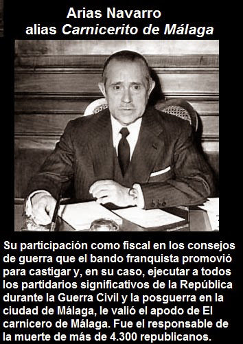 En su condición de fiscal, durante la guerra civil Carlos Arias Navarro (1908-1989) ingresó en el Ejército franquista como capitán honorario adscrito al cuerpo jurídico militar y tuvo un destacado papel en la represión que se produjo en Málaga. Se le conoce como el «carnicero de Málaga», pero no porque fuera hijo de un empleado del Matadero Municipal de Madrid sino porque participó en la muerte de miles de republicanos.