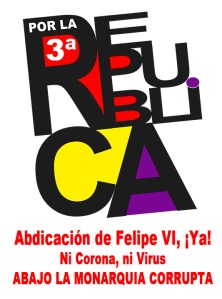 Os llamamos a todos, hombres, mujeres, jóvenes, a las clases trabajadoras y populares a que, incluso en la complicada situación producida por la cuarentena sanitaria, lo manifestéis (en esta ocasión) desde vuestras casas, balcones, ventanas…, colocando banderas republicanas, poniendo el Himno de Riego, cantando música popular republicana, divulgando por las redes la República, enviando los mensajes con el hashtag #14AbrilRepúblicaYA, pidiendo a nuestros ayuntamientos que coloquen la bandera republicana en el balcón, en definitiva, dándole a la semana del 13 al 19 de abril, que hemos llamado “Semana por la III República. Ni Corona ni virus”, todo el protagonismo a las reivindicaciones populares y la consecución de la anhelada III República que nos traiga más democracia, justicia e igualdad y eche al basurero de la Historia a la monarquía.
