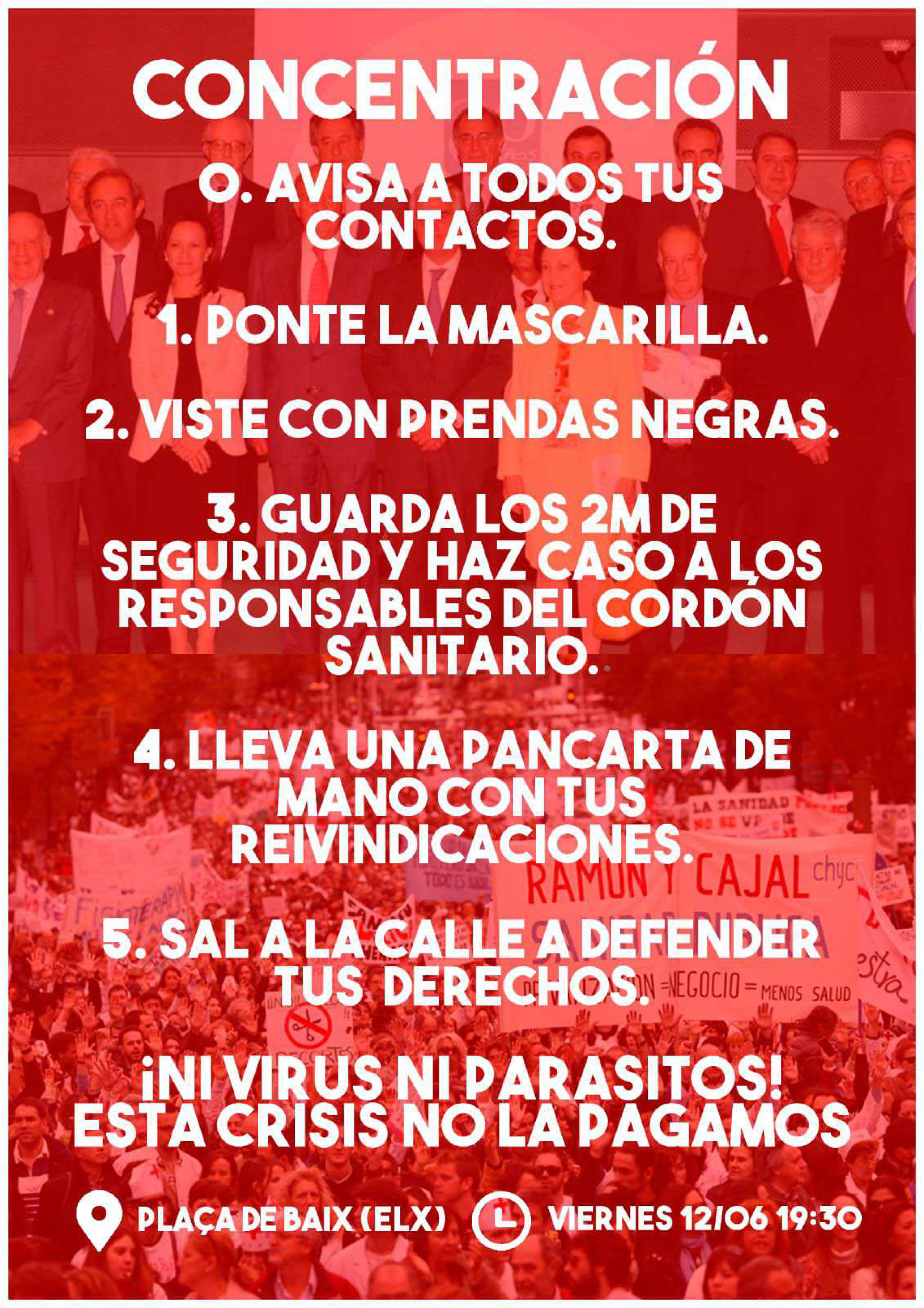 Diferentes partidos, sindicatos y otras organizaciones sociales estamos convocando a una concentración en Elche para este viernes 12, a las 19:30 en la Plaça Baix. Es un paso, sin duda positivo y que expresa la preocupación de mucha gente por lo que está sucediendo y la urgencia que sentimos por dar una respuesta. Sin embargo, no es suficiente: este debe ser un primer paso en la recuperación del “músculo” de la movilización social. Todas las gentes de bien, todos aquellos que han aplaudido al personal sanitario, que se preocupan por el bienestar del vecino y de nuestros ancianos y ancianas, todo el conjunto de las asociaciones vecinales, solidarias, culturales, deportivas, etc., debemos ser conscientes de lo que nos jugamos.