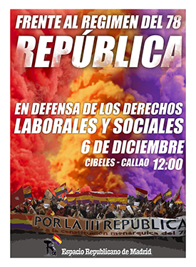 Siendo conscientes de todo ello, llamamos a la unidad popular contra las mentiras de la constitución monárquica y en defensa de la verdadera democracia, la democracia republicana, con la seguridad de que una vez movilizado el conjunto de nuestro pueblo hacia ese objetivo, el proletariado, la capa más explotada y engañada por las mentiras del Régimen, no se dejará arrebatar la posición de vanguardia, ni se dejará volver a encadenar a los engaños reformistas, revisionistas y socialdemócratas que tanto daño han hecho a nuestra clase a lo largo de la historia.