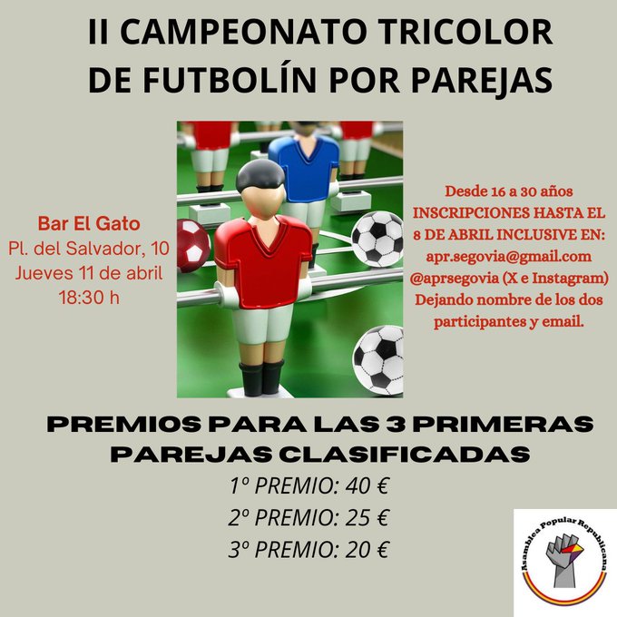 Hace un par de horas (jueves, 11 de abril), en el marco de la XlV Semana Republicana, finalizaba la segunda edición del Campeonato Tricolor de Futbolín Juvenil, organizado por la Asamblea Popular Republicana.