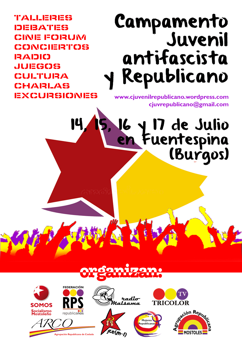 El campamento ha sido organizado, con la colaboración del Ayuntamiento de Fuentespina, por diferentes asociaciones juveniles, como Jóvenes Republicanos, Socialismo Mostoleño (SOMOS), JCE (m-l), etc. Seguir leyendo Segovia: Acto de presentación del Campamento Juvenil antifascista y republicano