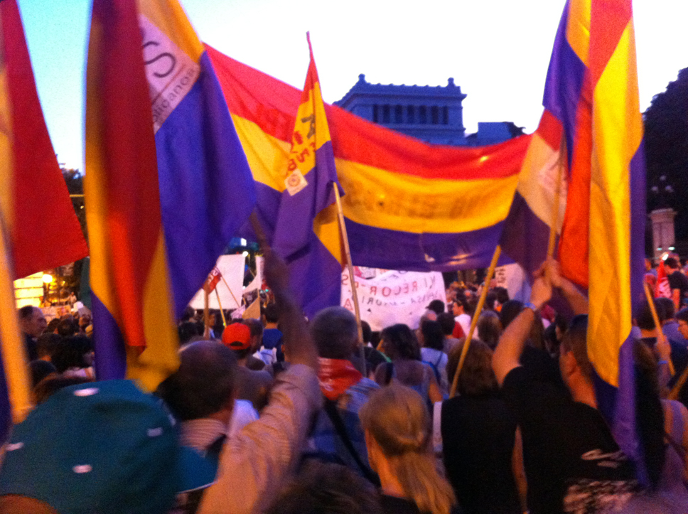 A las seis de la tarde del sábado 27 de Octubre, la Plaza de España en Madrid fue llenándose de gentes de todas las edades venidas de los barrios y pueblos, dominaba ampliamente la gente joven y proliferaban las banderas republicanas.