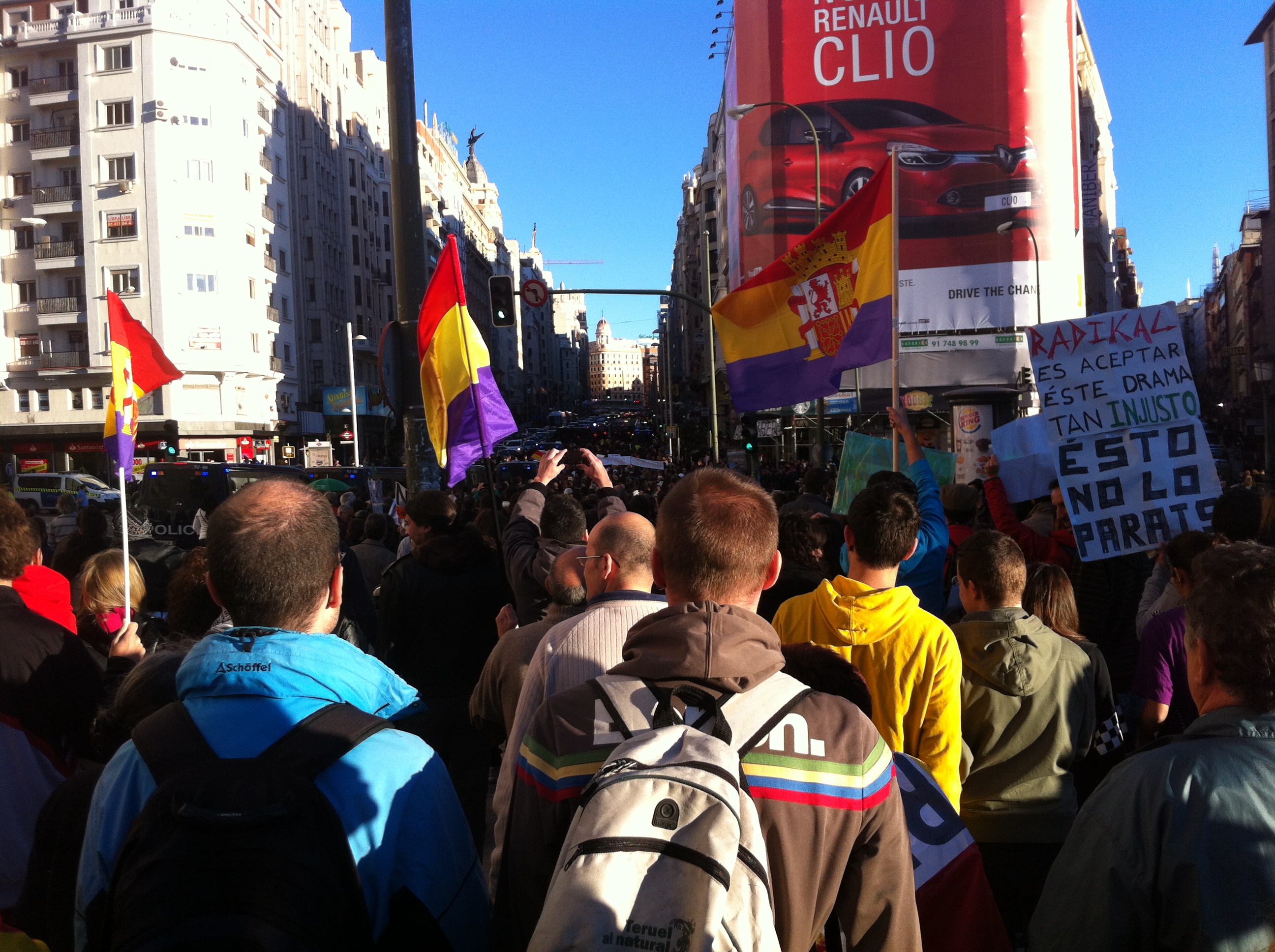 Miles de personas llenaron la Gran Vía, el 27 de Octubre se conquistó la calle, no se había pedido autorización para la manifestación ( el 25 de septiembre, a la persona que hizo la petición la multaron con 6000€ ) y la presencia de decenas de miles de pacíficos y airados manifestantes impusieron su derecho a manifestar su repulsa al Gobierno mentiroso, a los bancos ladrones, al sistema que salva a los corruptos y desahucia a las familias, gritos pidiendo la dimisión del Gobierno, el paro para el Jefe del Estado…y un grito unánime llamando a la Huelga General. Seguir leyendo Madrid: EL 27 DE OCTUBRE SE CONQUISTÓ LA CALLE