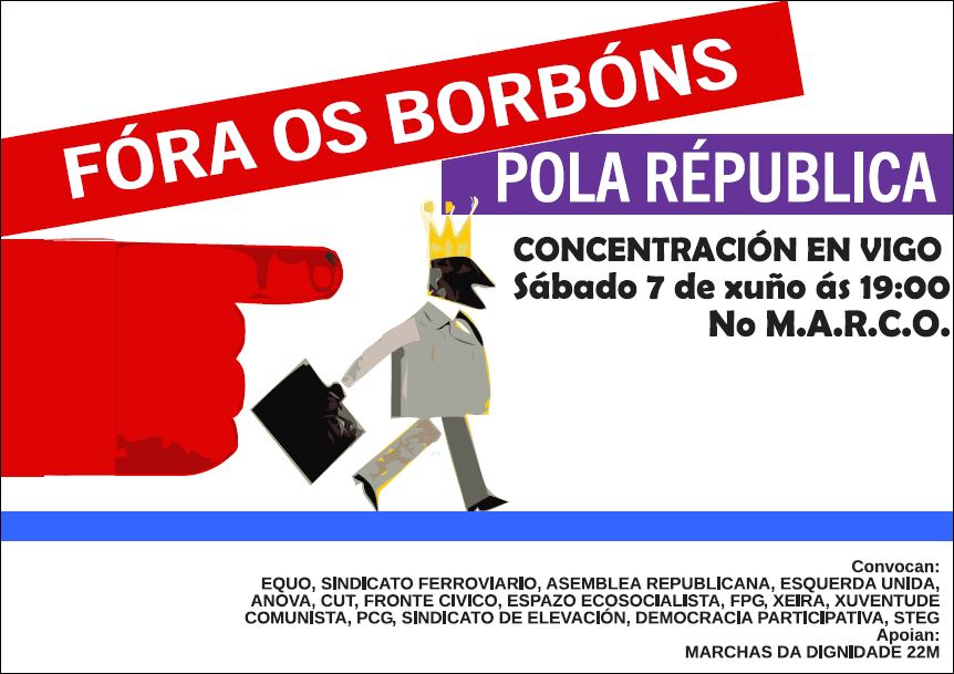 DIVERSOS COLECTIVOS SINDICAIS, POLITICOS E SOCIAIS, EN REXIME DE AUTOCONVOCATORIA CONVOCAN EN VIGO DIANTE DO MARCO ESTE SABADO 7 DE XUÑO EN AS 19:00 A CIDADANIA A SAIR A RUA CO LEMA “FORA ÓS BORBONS, POLA REPÚBLICA”.