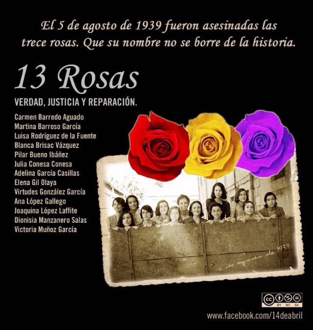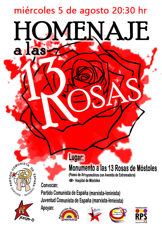 Este miércoles, día 5, a las 20;30hrs participaremos en el acto organizado por el Partido Comunista de España (marxista-leninista) en Móstoles y apoyado por Federación de Republicanos, Agrupación Republicana de Móstoles, Mujeres Republicanas y Unión Trans Obrera para recordar y homenajear a las #13Rosas en el aniversario de su asesinato. Ningún nombre se borrará de la historia. Seguir leyendo Móstoles: Homenaje a las Trece Rosas en el aniversário de su asesinato