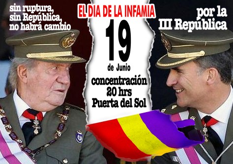 El 19 de junio de 2014, tras la abdicación precipitada de Juan Carlos I en su hijo, fue proclamado rey Felipe VI. Despreciando el clamor popular que demandaba un referéndum para que los españoles decidieran la forma de Estado, eligiendo entre monarquía o república, el Partido Popular, con el apoyo del PSOE, decidió de forma apresurada acelerar los trámites legales para que el príncipe Felipe se convirtiera en el nuevo monarca borbónico. Seguir leyendo 19 de Junio: EL DÍA DE LA INFAMIA