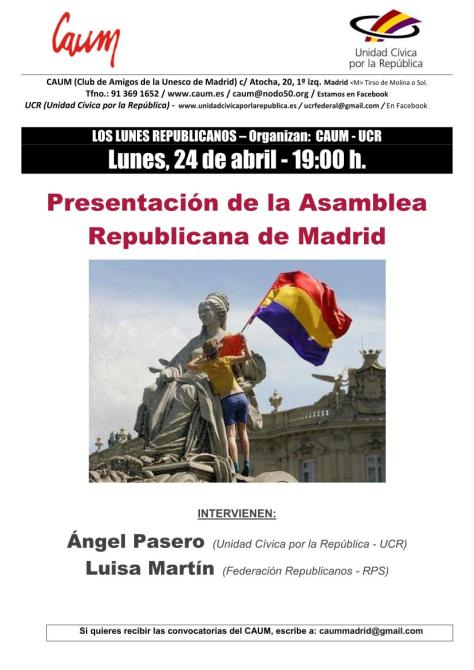 Hoy se presenta en el CAUM la Asamblea Republicana de Madrid como colofón del Primer Encuentro Republicano de la Comunidad de Madrid y del provisionalmente llamado Espacio Republicano de Madrid. La presentación corre a cargo del compañero Ángel Pasero de Unidad Cívica por la República y por Federación de Republicanos de nuestra compañera Luisa Martín.