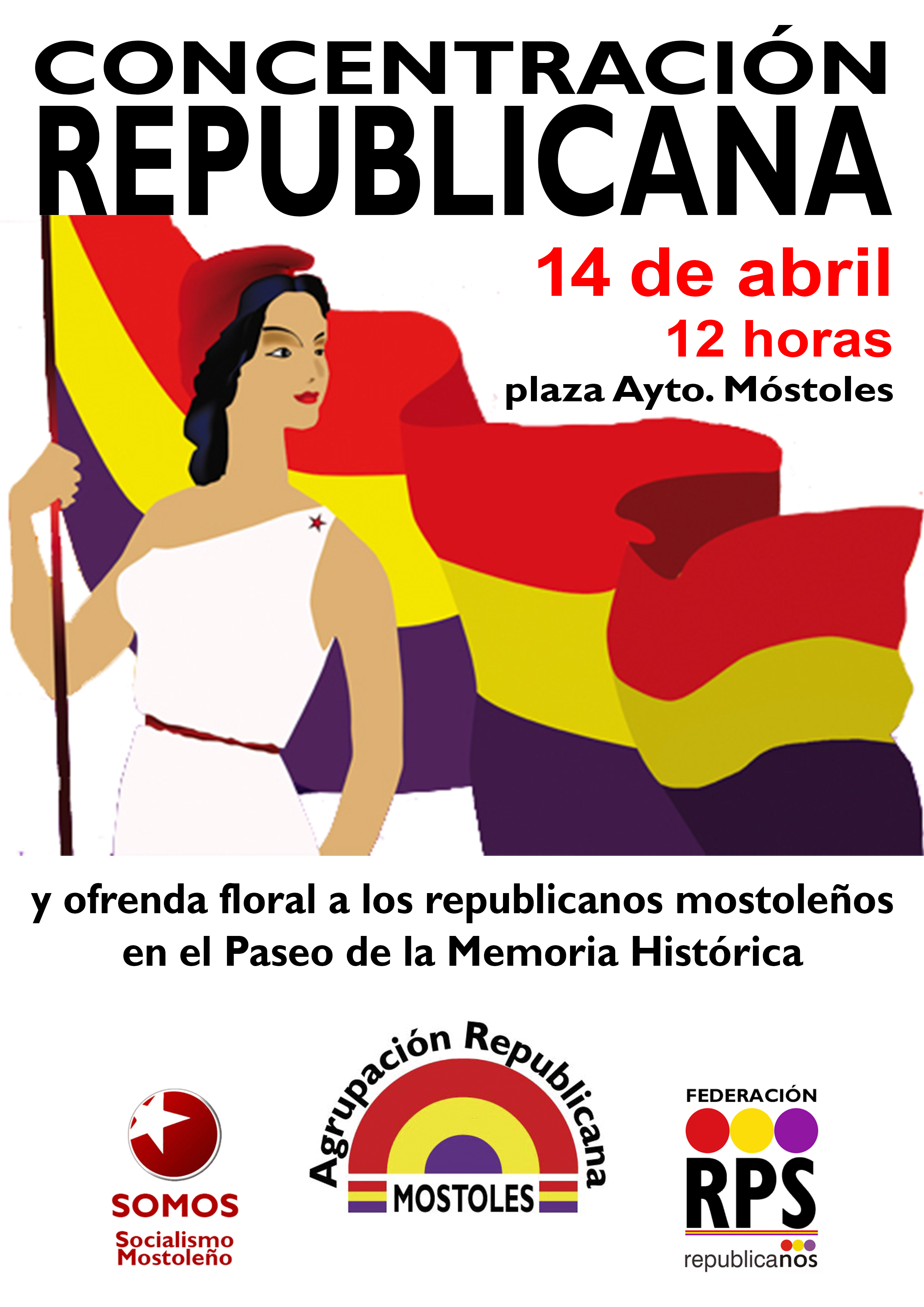 La Agrupación Republicana de Móstoles llama a todos los vecinos, colectivos, organizaciones, sindicatos y partidos a concentrarse el dia 14 de abril en la plaza del Ayuntamiento de Móstoles a las 12 horas, en defensa de nuestros derechos y por la III República, la única que puede garantizarlos porque sin ruptura, sin República, no habrá cambio. Posteriormente iremos de marcha al paseo de la Memoria Histórica de parque Liana para hacer una ofrenda floral a los republicanos mostoleños asesinados y por extensión de todas las víctimas del franquismo.