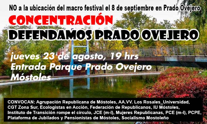 Concentración en defensa del Parque Prado Ovejero contra la ubicación en dicho parque del Macrofestival de música Amanecer Bailando 2018 previsto para el 8 de septiembre de 2018 que el Gobierno municipal de Móstoles (PSOE-GM/PODEMOS e IUCM) ya quiso ubicar en el parque natural de El Soto y tuvo que cambiarlo ante la oposición de las AAVV, partidos políticos y organizaciones populares.