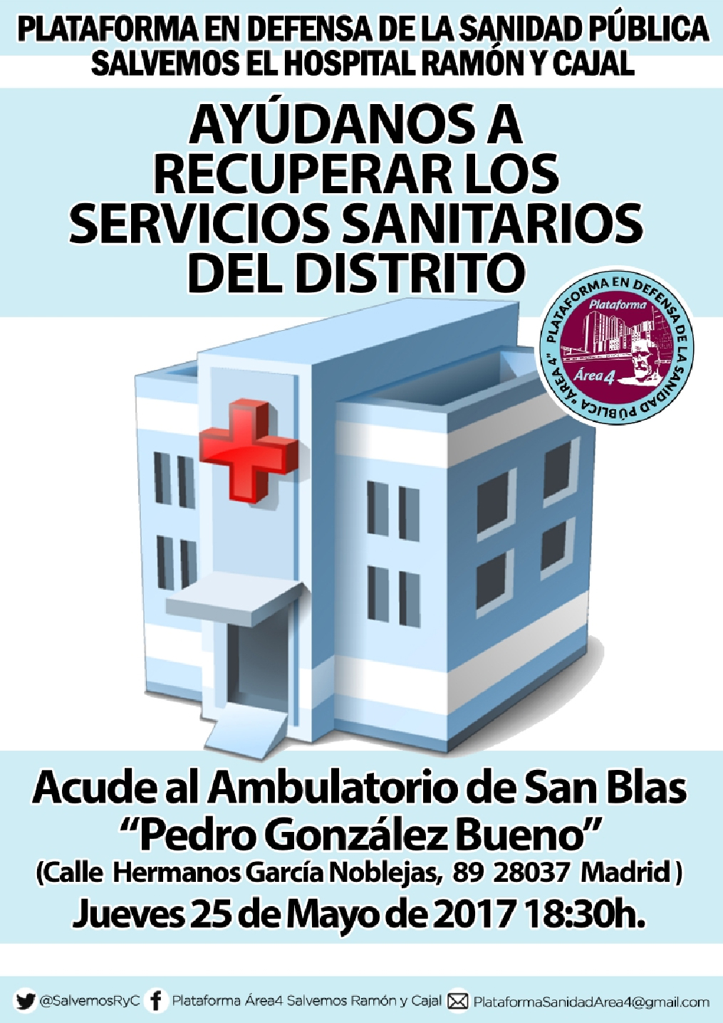 LA PLATAFORMA POR LA DEFENSA DEL HOSPITAL UNIVERSITARIO DE MÓSTOLES de la que forma parte el Sindicato CCOO, en su compromiso de mantener a los trabajadores y trabajadoras, así como a la ciudadanía, lo más ampliamente informada de todo lo que acontece en relación con nuestro Hospital Público Universitario, y en definitiva, de los Planes de la Comunidad de Madrid en el ámbito sanitario, informará el próximo día 17 de mayo a las 19:00horas en el Teatro «El Bosque» a la ciudadanía, de las pretensiones de la Comunidad de Madrid de convertir éste hospital en uno de camas de media y larga estancia , lo que significa: