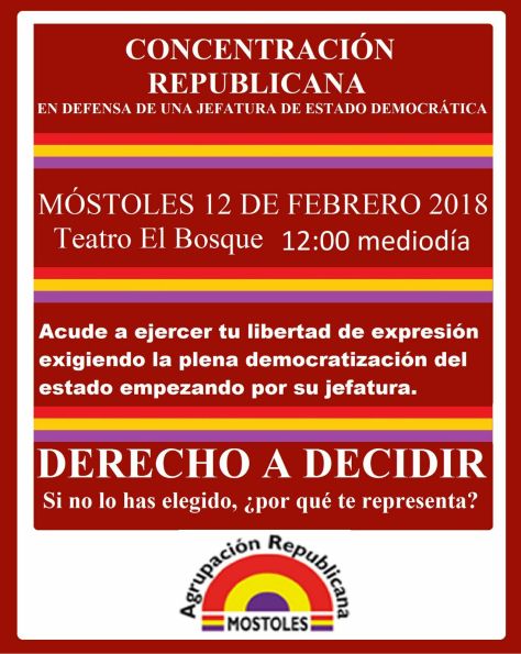 Tras salir la noticia que Felipe VI y consorte van ir el próximo dia 12 a Móstoles diversas organizaciones y partidos republicanos han convocado una concentración frente el teatro El Bosque a las doce de la mañana en defensa de una jefatura de estado democrática y el derecho a decidir a la que se suma Federación de Republicanos.