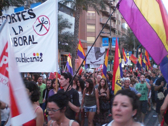 Una multitud que, más que nunca, levantó las banderas tricolores, dentro y fuera del bloque de los Republicanos -ni una sola estanquera en todo el recorrido-, para seguir gritando con fuerza que «El pueblo, unido, jamás será vencido». Pero también para crear nuevos lemas acordes con las brutalidades del momento: «La Fabra, la Fabra…», coreaban unas jóvenes junto a nosotros, para después entonar juntos un «Que se jodan, que se jodan, los chorizos que nos roban», o la más política «Somos la fuerza, somos el trabajo, y vamos a echar al Gobierno abajo». Pero, sin duda, las consignas que surgían con más fuerza de las gargantas eran los que daban perspectiva política al momento: «Gobierno, dimite, el pueblo no te admite» y, sobre todo, «España, mañana, será republicana» unieron durante horas de recorrido cientos de corazones de jóvenes y mayores que entienden, más allá de lo inmediato, la necesidad de una salida republicana a la crisis para asegurar los intereses y derechos de la mayoría trabajadora. Seguir leyendo El 19J en Alacant