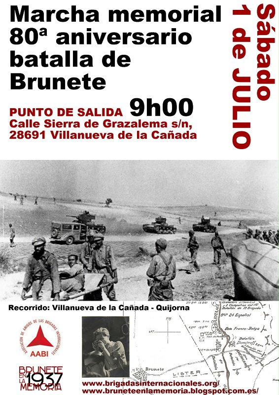 Por décima vez vamos a realizar esta marcha en el campo de batalla de Brunete. Este año se hará en torno a Quijorna, recorriendo los lugares donde luchó la 35 división republicana, bajo el mando del general Walter, y más en particular la XI BI, compuesta por los batallones Edgar André, Thälmann, Hans Beimler y 12 de Octubre.