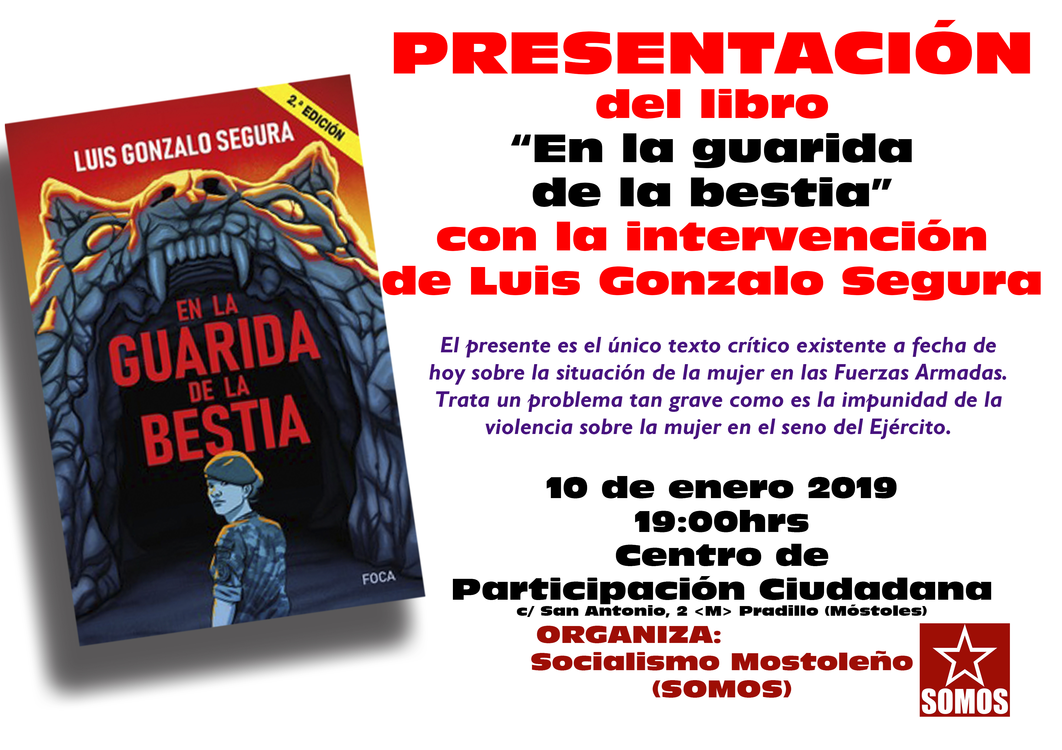 Organizado por Socialismo Mostoleño (SOMOS) se presentará el próximo 10 de Enero a las 19 horas en el Centro de Participación Ciudadana de Móstoles el libro del exteniente Luis Gonzalo Segura «En la guarida de la bestia».