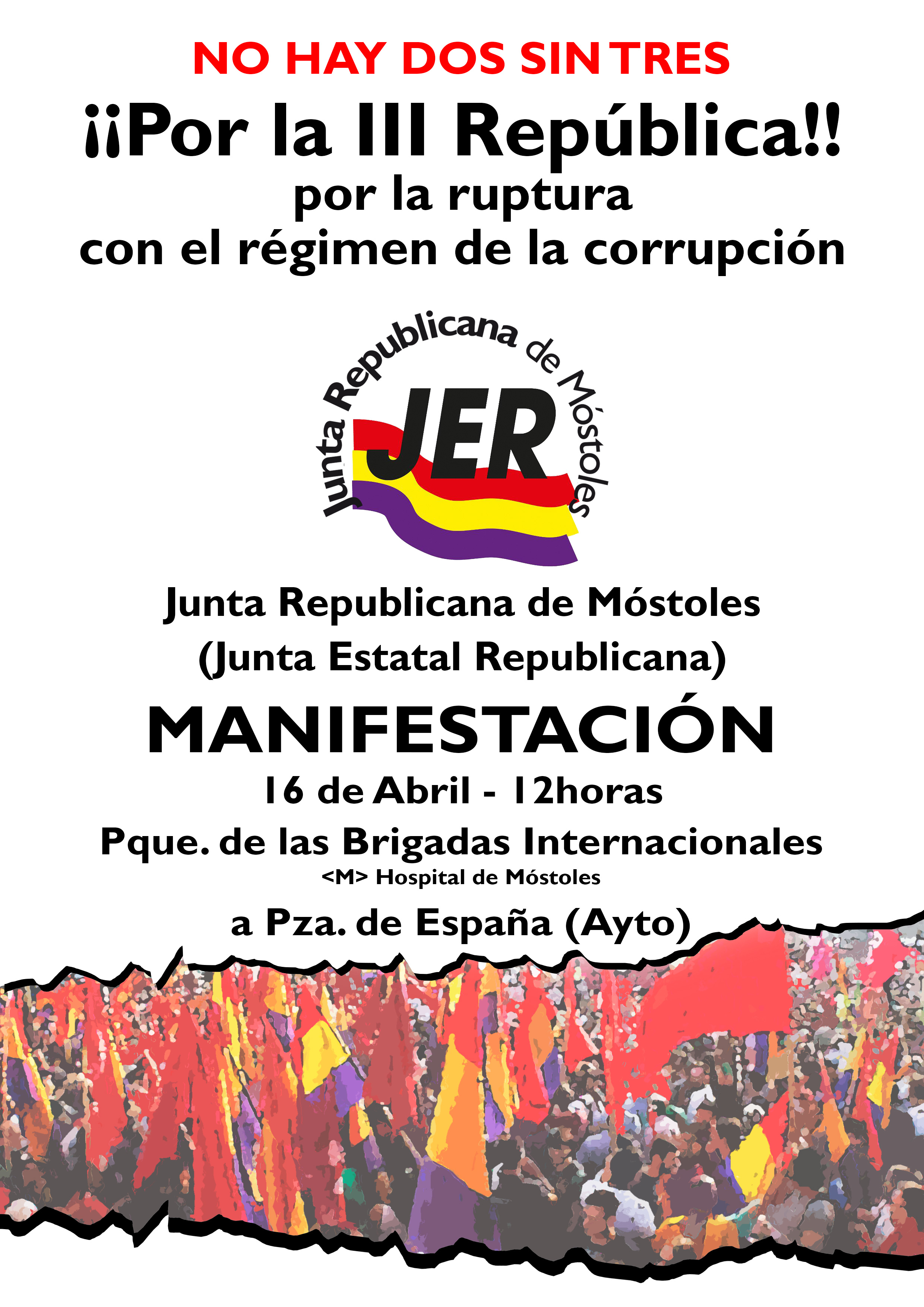 Convocada por la Junta Republicana de Móstoles, organización integrada por Socialismo Mostoleño, Federación de Republicanos, PCM, UJCE, PCE(m-l), IU y republicanos a título individual, se ha realizado bajo una insistente lluvia la Tercera manifestación republicana en Móstoles bajo el lema “No hay dos sin tres”.