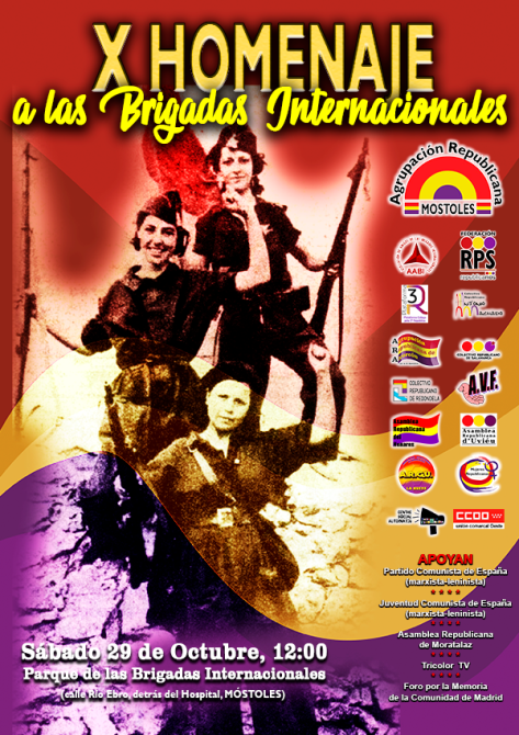 Este sábado Móstoles vivirá la décima edición del homenaje a las Brigadas Internacionales. Una fecha muy especial para un acto muy especial al que os invitamos. No olvidéis vuestra bandera tricolor y vuestras fuerzas para tirar abajo este Régimen de corrupción.