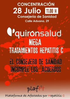 Hospitales del GRUPO QUIRÓN (Fresenius Helios) –Fundación Jiménez Díaz y Hospital Infanta Elena de Valdemoro- están negando tratamientos a enfermos de Hepatitis C En fases F0 y F1, a pesar de la orden dada por la Consejería de Sanidad con fecha 17 de noviembre de 2016 y de que el Consejo de Interterritorial celebrado el pasado 21 de junio, dio luz verde a tratar a los F0 y F1. Seguir leyendo HOSPITALES DEL GRUPO QUIRÓN SALUD NIEGAN LOS TRATAMIENTOS A UNA SERIE DE PACIENTES EN LA COMUNIDAD DE MADRID